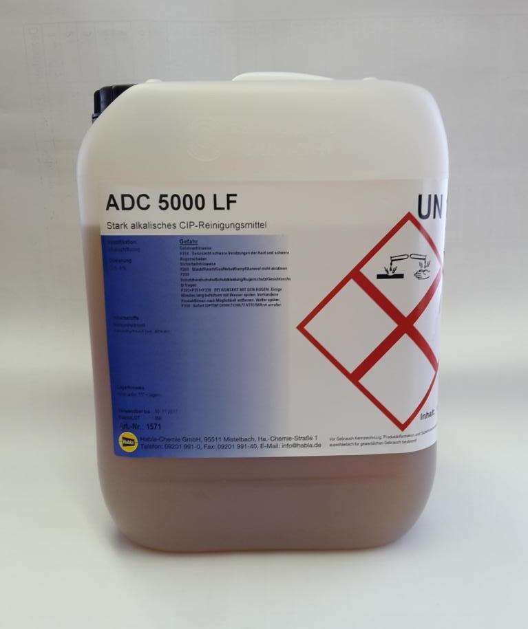 Stark alkalisches, schaumgedämpftes Reinigungsmittel. ADC 5000 LF kann in allen Arten von CIP-Reingungssystemen, sowie in der Umlauf- und Sprühreinigung eingesetzt werden. Der beim alkalischen Reinigungsprozess manchmal auftretende störende Schaum wird wirkungsvoll unterdrückt. Nicht einsetzbar für die Tank- und Behälterreinigung unter CO2 Atmosphäre. Nicht für Aluminium, Zink und Leichtmetalle geeignet.
